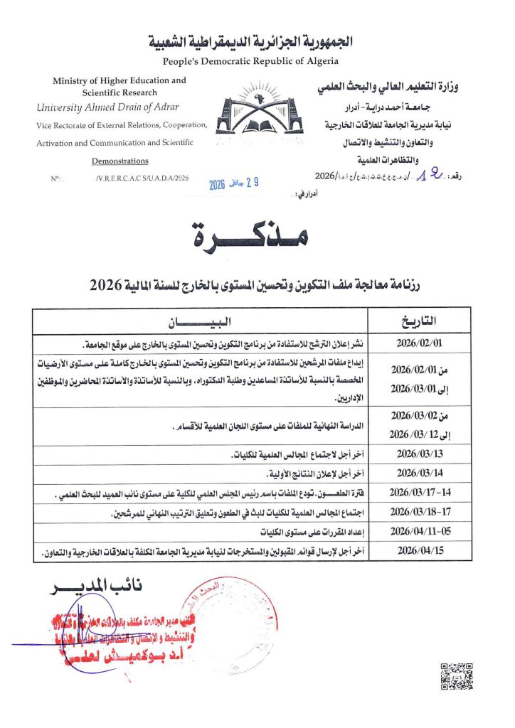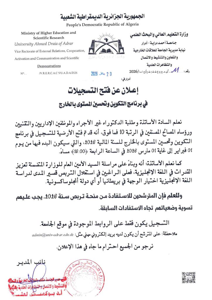 إعلان عن فتح التسجيلات في برنامج التكوين وتحسين المستوى بالخارج 2026