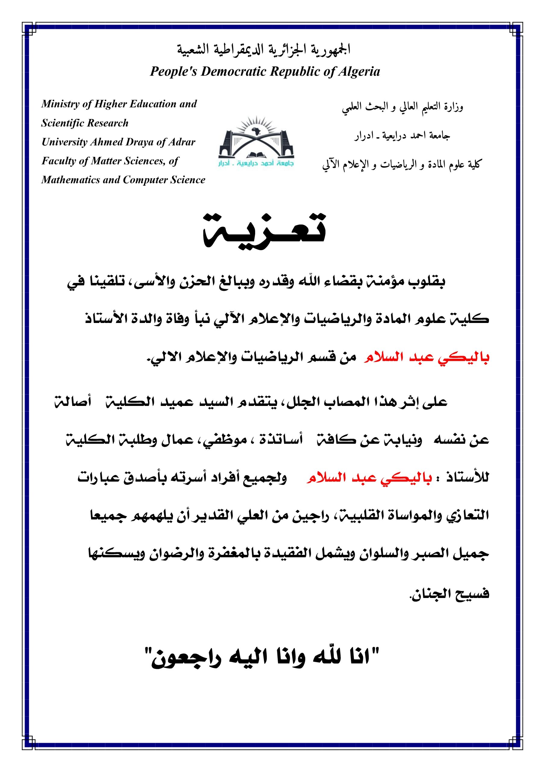 Faculté des Sciences de la matière, Mathématiques et Informatique - Faculties of Ahmed DRAIA University - ADRAR, ALGERIA