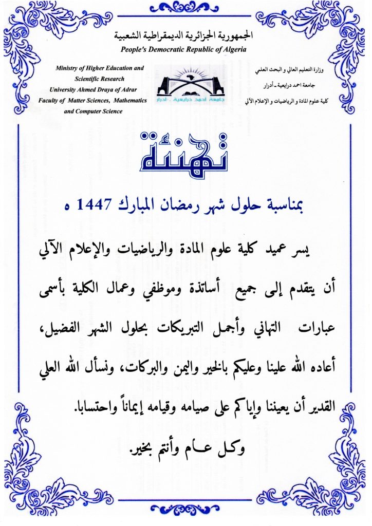 Faculté des Sciences de la matière, Mathématiques et Informatique - Faculties of Ahmed DRAIA University - ADRAR, ALGERIA