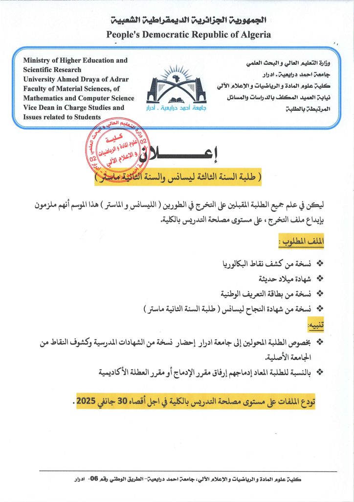 اعلان للطلبة السنوات النهائية الليسانس والماستر