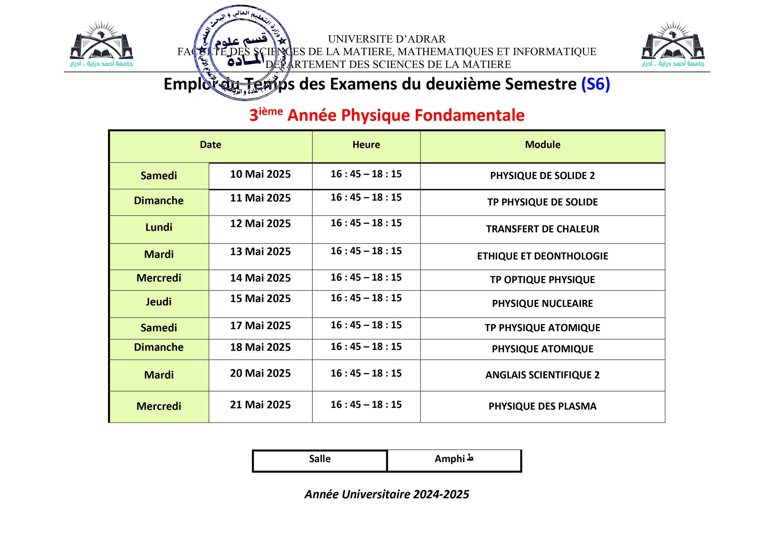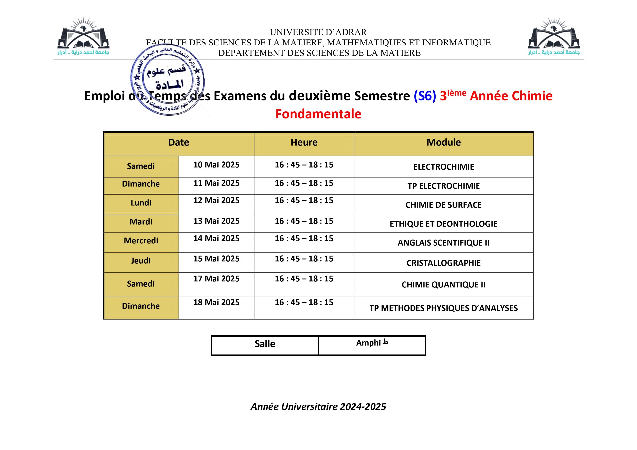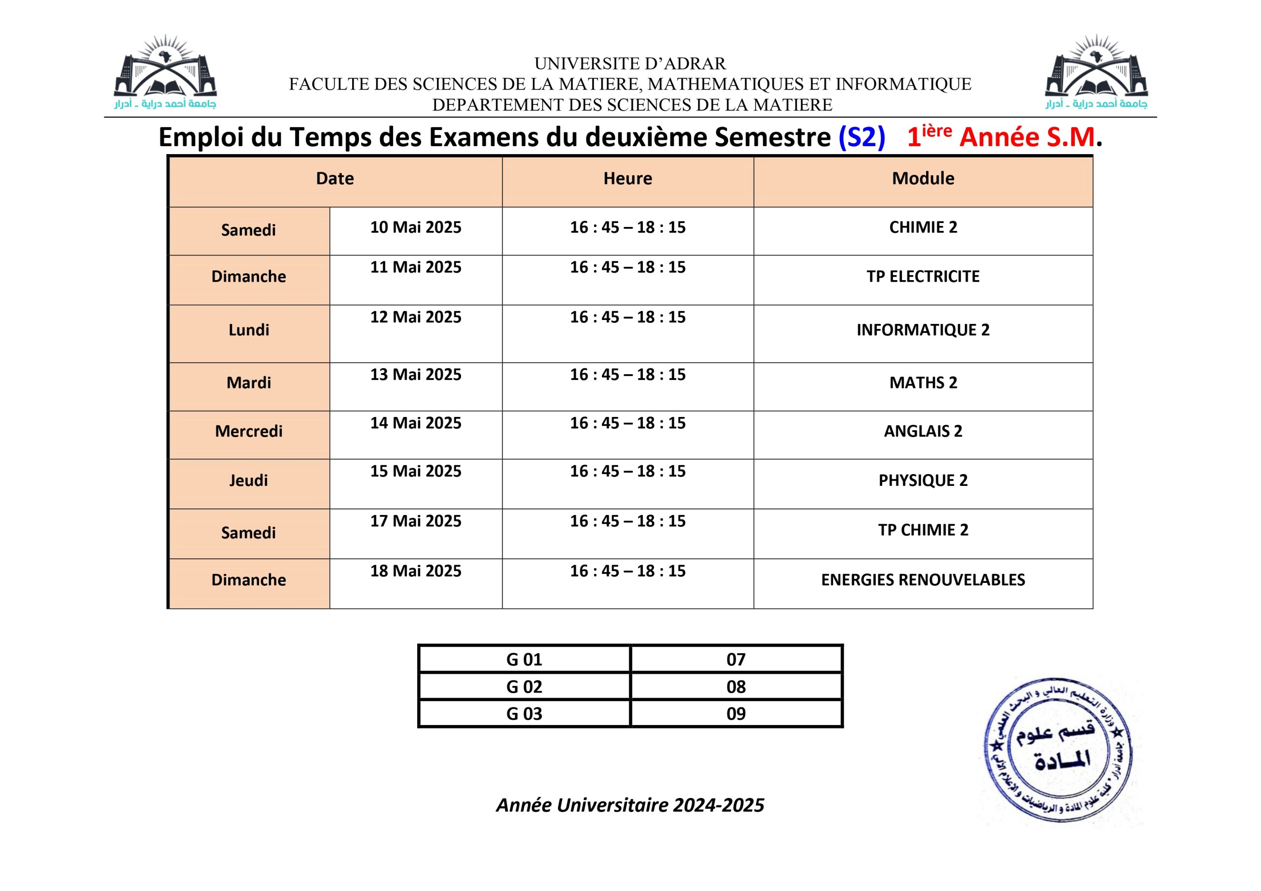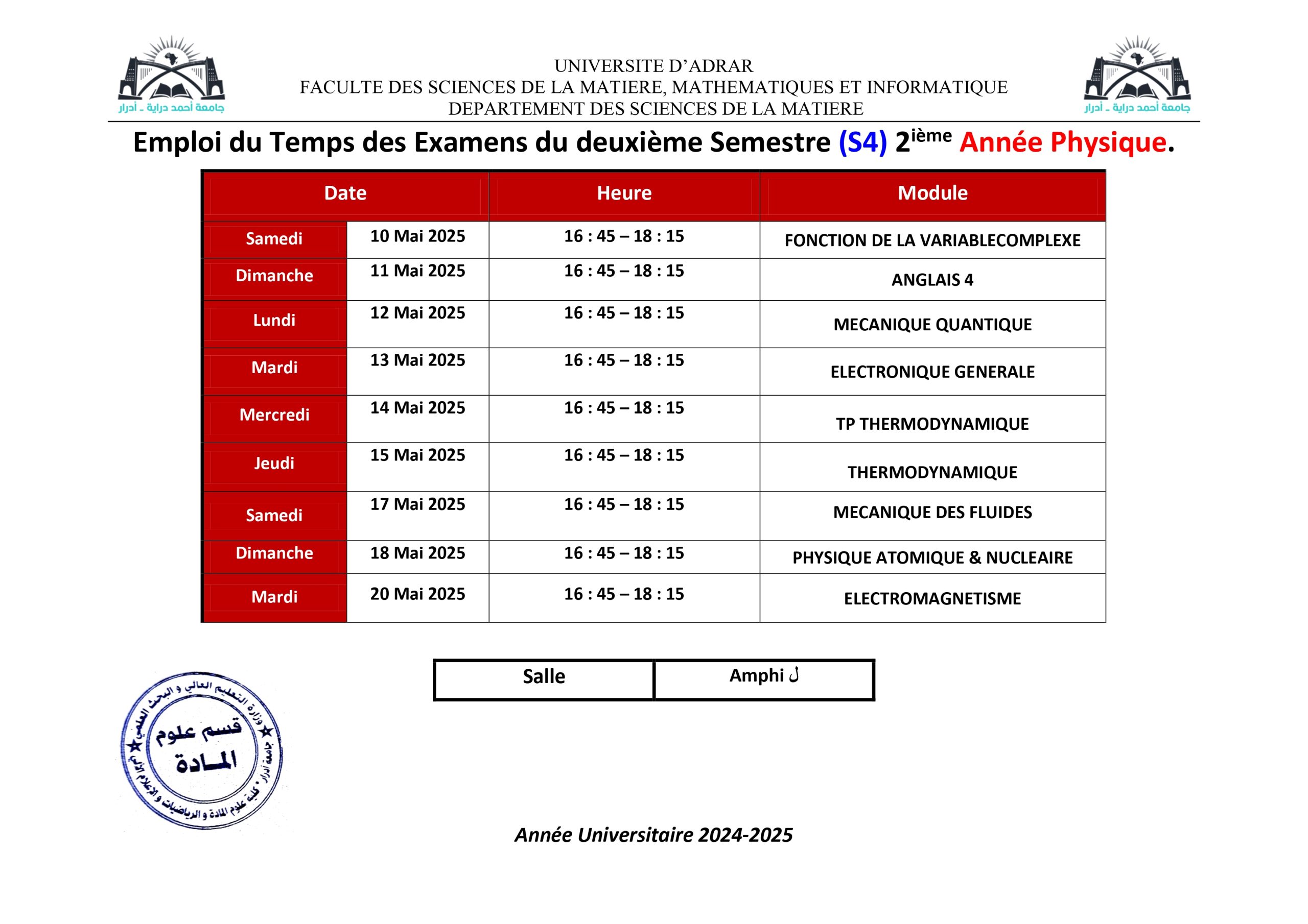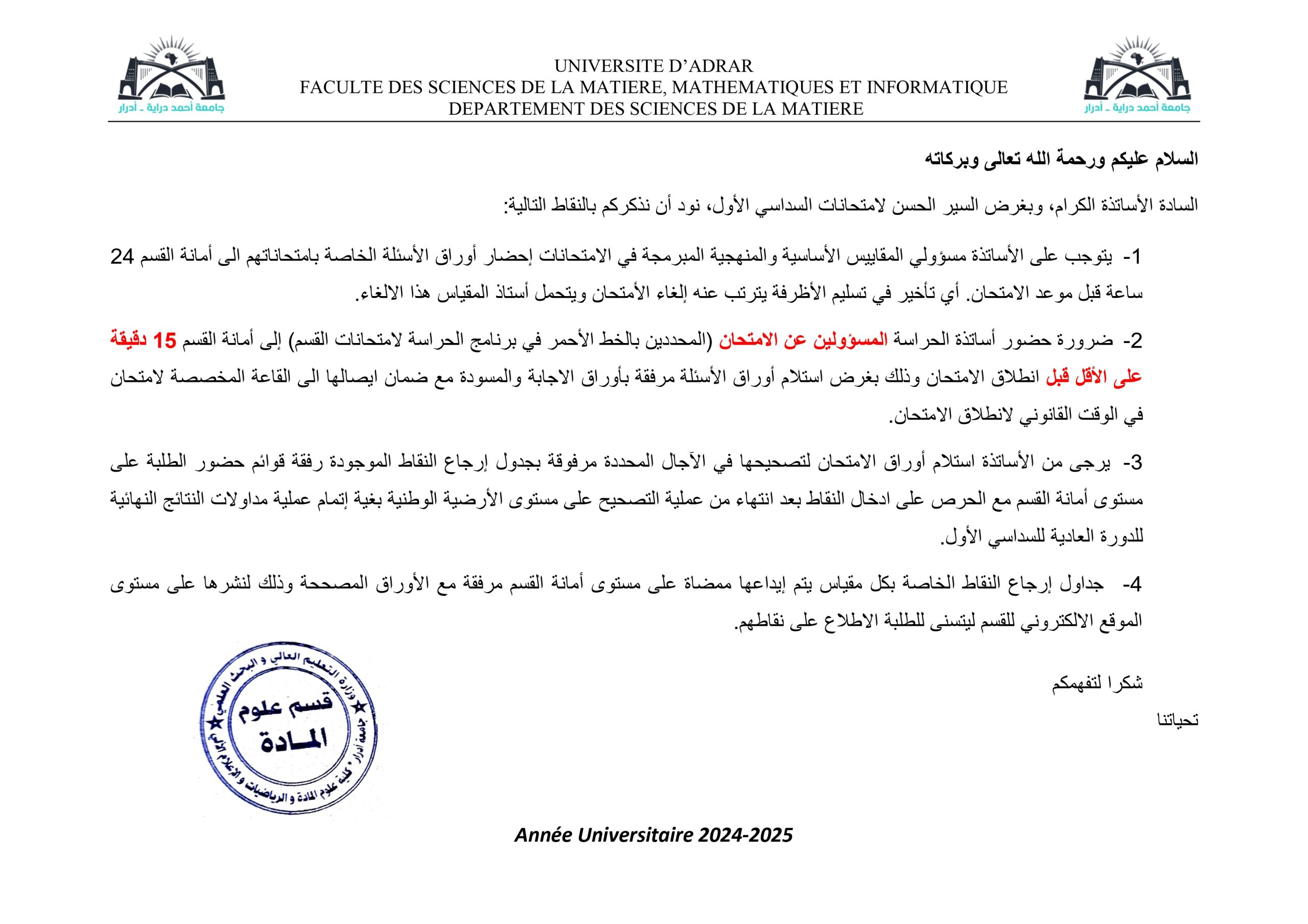 رزنامة امتحانات الدورة العادية للسداسي الثاني قسم علوم المادة للموسم الجامعي 2024-2025 0 310 Share 0 310 Share
